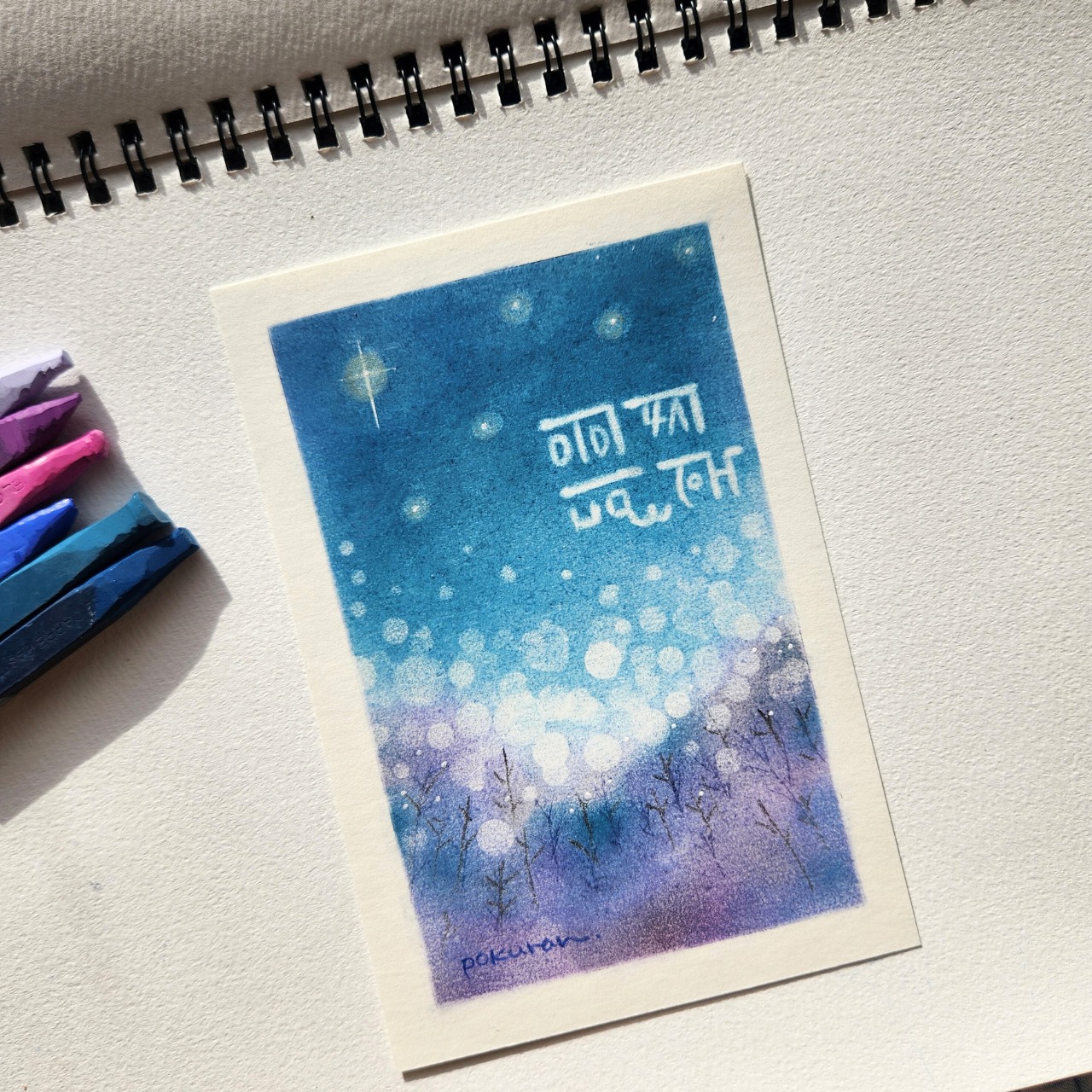 夜の森をイメージした幻想的なパステル画の中に「ふくろう」の龍体文字を組み合わせることで独自の世界観を表現しました。